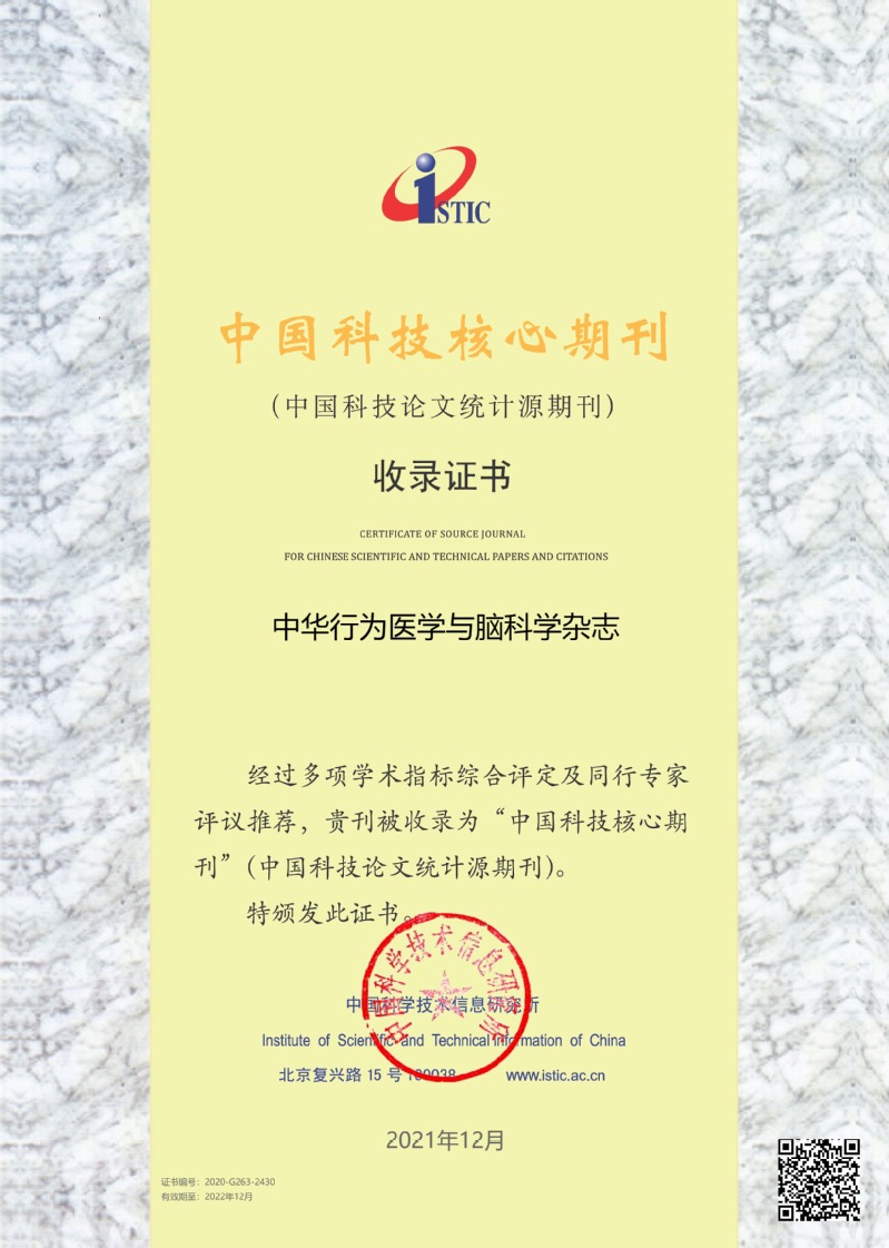 《2021年版中国科技期刊引证报告(核心版)自然科学卷》报告,《中华行为医学与脑科学杂志》核心总被引频次1889次,在33种神经病学与精神病学类期刊学科排名第5位;综合评价分46.2分,学科排名第3位;核心影响因子1.327,学科排名第4位,较上年增长22.3%,创历史新高!