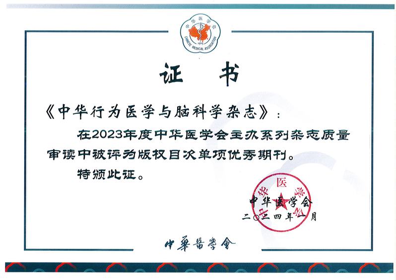 近日,中华医学会发布2023年度系列杂志综合质量评审报告,《中华行为医学与脑科学杂志》学术质量排名第21位,综合质量排名第22位。