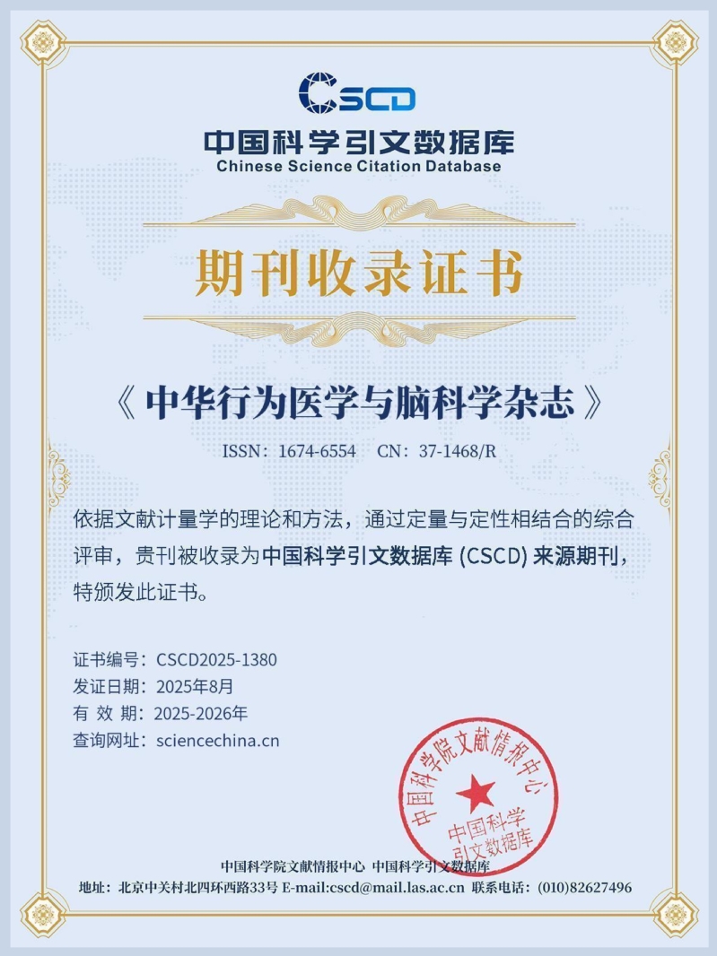 《中华行为医学与脑科学杂志》再次入选CSCD来源期刊(已连续入选26年),标志着期刊整体质量与影响力得到持续认可。